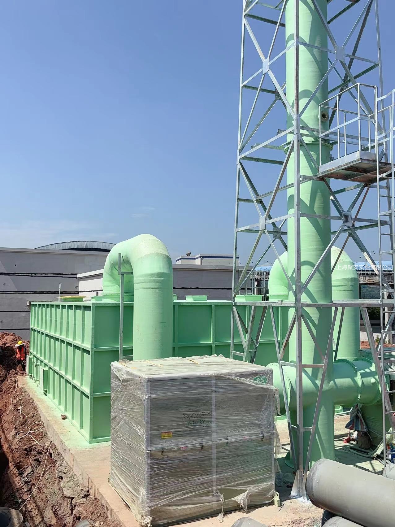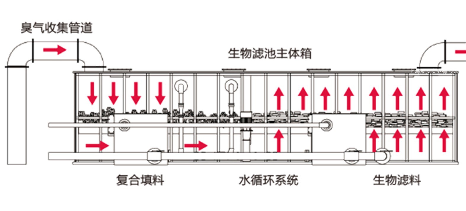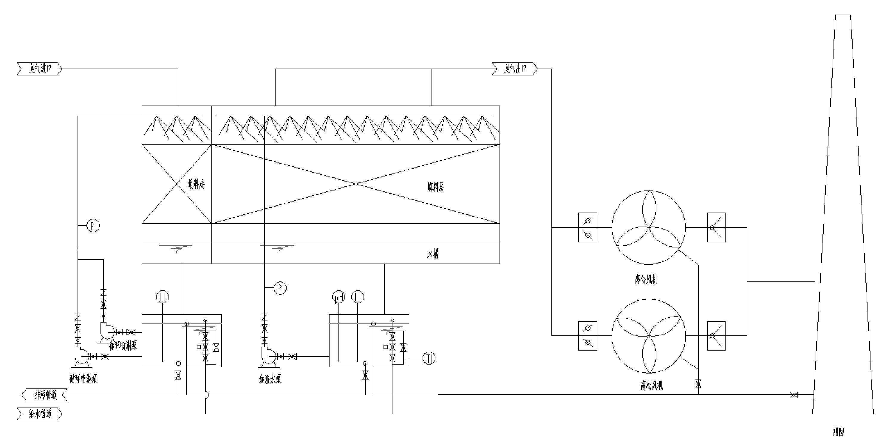 1.恶臭气体经过填料层,被浸湿的填料吸附或填料层水膜溶解,恶臭污染物从气相转移到液相。