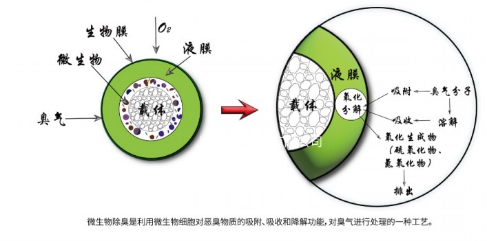 2.被溶解和吸附的恶臭分子被填料上的微生物菌群摄取或被胞外酶分解成小分子。